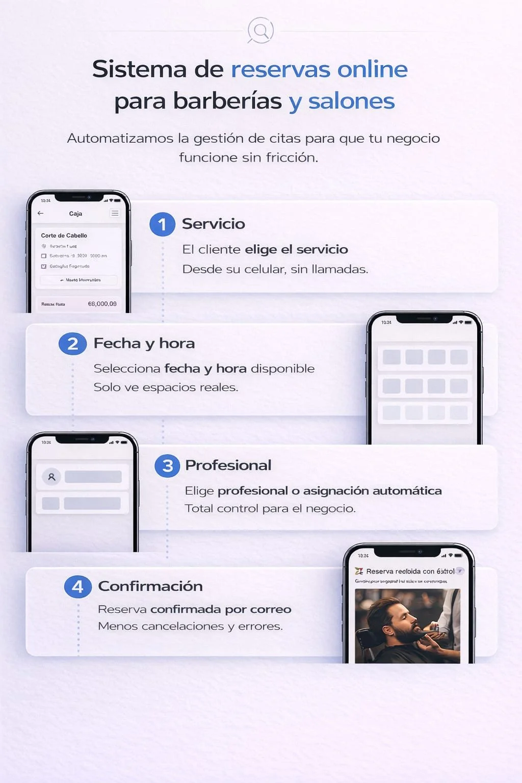 Sistemas de reservas, marketing automatizado, programa de lealtad para barberías y salones de belleza.